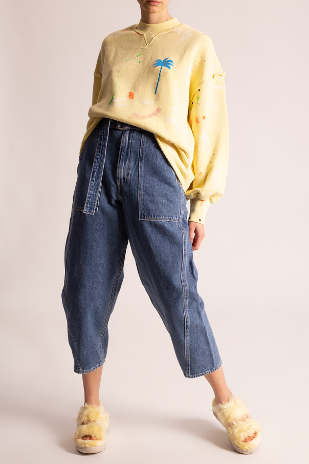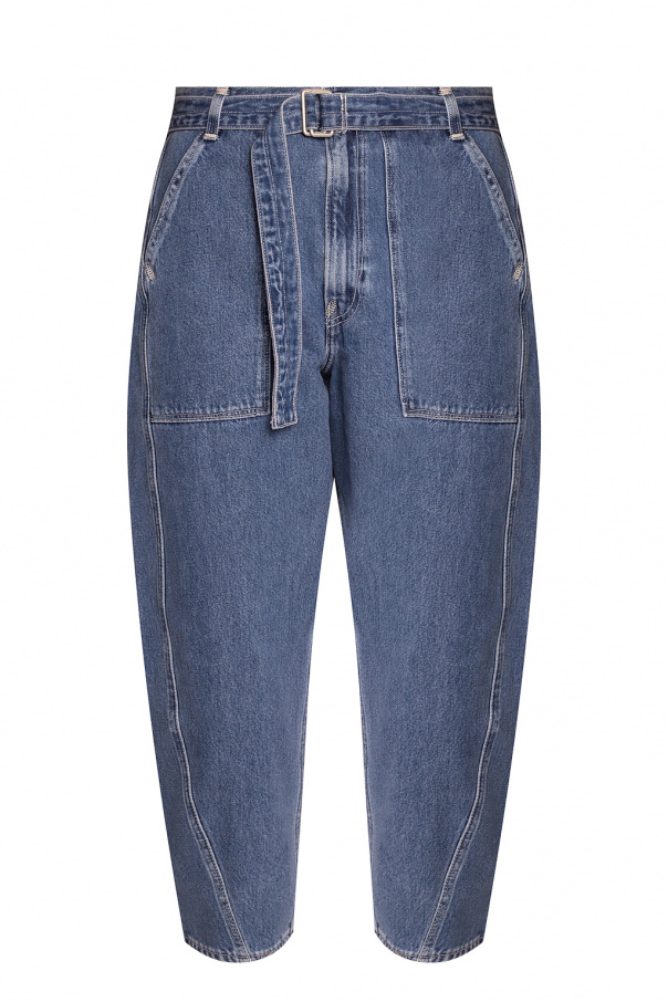 Blue stonewashed jeans from Levi’s, the ‘Red’ collection. Crafted in cottonised hemp denim, this pair falls down with tapered legs and features a zip fly with a button, adjustable belt, yellow and red logo patch, distinctive white stitching details, two front pockets and two back pockets.