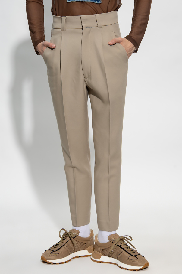 Greyish beige trousers from Fear Of God. Made of wool, this pair falls with slightly tapered legs and features a zip fly with a button and hook & eye closure and four slip pockets.