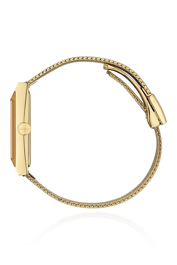 Gold-tone ‘G-Frame’ watch from Gucci. Made of stainless steel, this item features a white, red and navy logo on the dial finished with mother-of-pearl, sapphire glass with antireflective coating and adjustable strap. Waterproof up to 30 m.