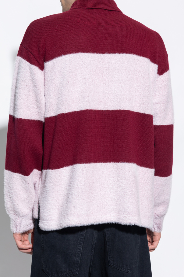 Red and pink ‘Jarvis’ sweater from Eytys. Crafted from wool, this long-sleeve style fastens with buttons and features a striped pattern, slits to the hem on either side of the garment and ribbing on the collar and cuffs.