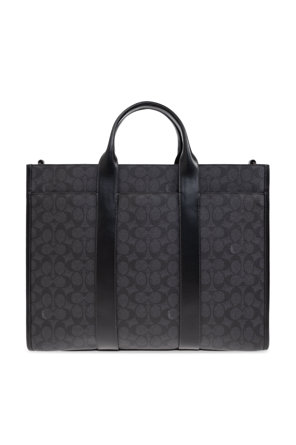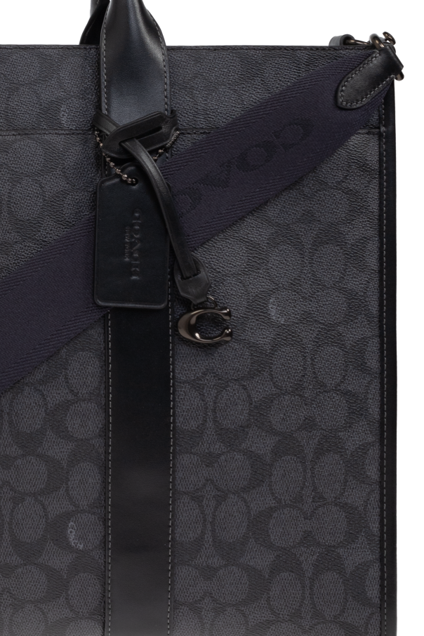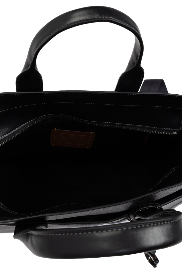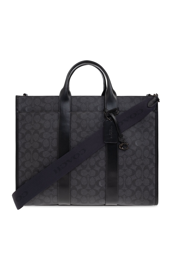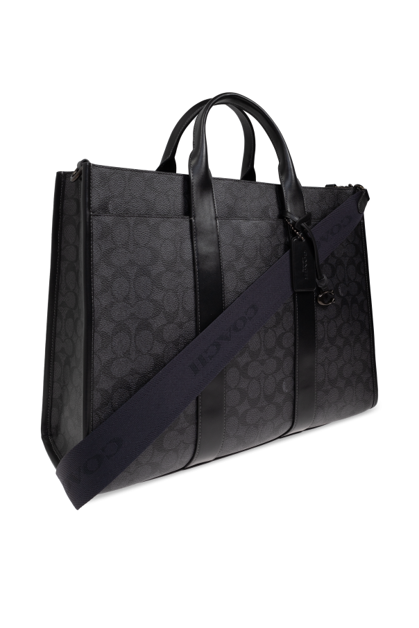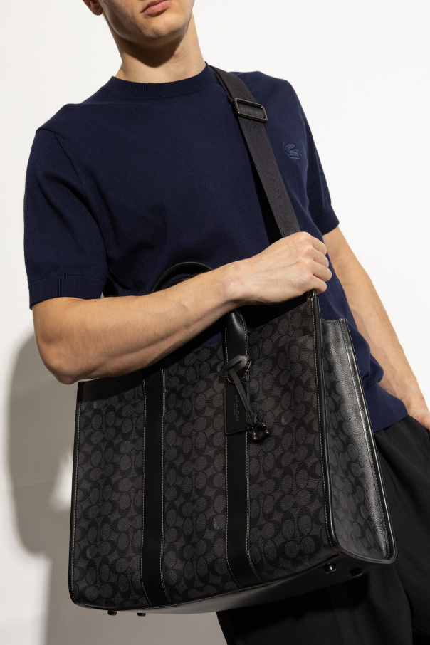 Introducing the Coach Document Bag, an epitome of elegance and functionality. This exquisite piece, predominantly in a rich black hue, is adorned with a distinctive pattern of geometric motifs, evoking a sense of timeless sophistication. Crafted from premium leather and canvas, this bag exemplifies superior craftsmanship, featuring robust finishes and a sleek rectangular shape, perfect for transporting documents. The bag boasts two comfortable hand-held straps and a detachable, adjustable shoulder strap, enhancing its versatility. The interior is thoughtfully designed with a spacious compartment for organized storage, complemented by a zippered pocket for securing essentials. Metal accents, including clasps, impart an added touch of refinement, while the branded tag attached to the bag signifies its exclusive nature. Embodying the quintessential American style, Coach, under the visionary direction of Stuart Vevers, continues to innovate while honoring its rich heritage. This document bag is not just an accessory, but a statement of style and practicality for the discerning professional. Why Choose This Product? Exquisite geometric design in classic black. Premium leather and canvas construction. Functional design with adjustable shoulder strap. Spacious interior with secure zippered pocket. Exclusive branding and elegant metal accents.