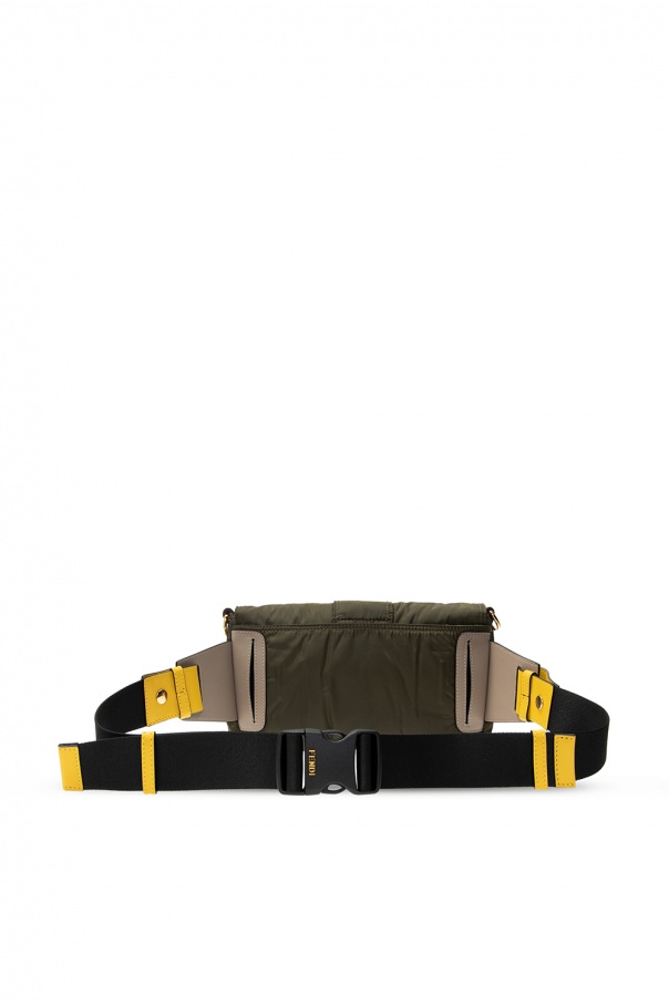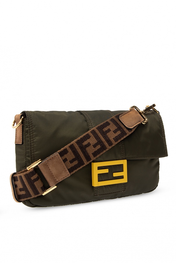 Green ‘Dolmias’ shoulder bag from Fendi. Emblazoned with yellow logo appliqué, this design comes with magnetic snap-button closure, suede trims, an external pocket secured with magnetic snap-button the back, a detachable and adjustable strap and interior with one compartment and one zipped pocket.