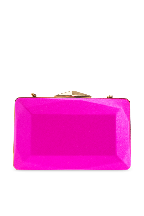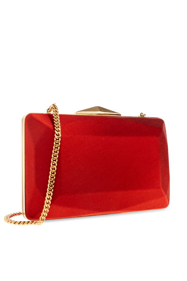 Red and neon pink ‘Diamond Box’ clutch from Jimmy Choo. Made of satin, this design features a diamond-shaped snap closure with an engraved logo, detachable shoulder chain, one internal compartment and gold-tone metal hardware.