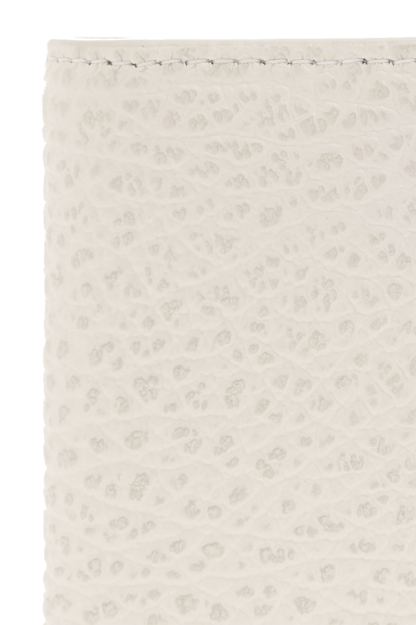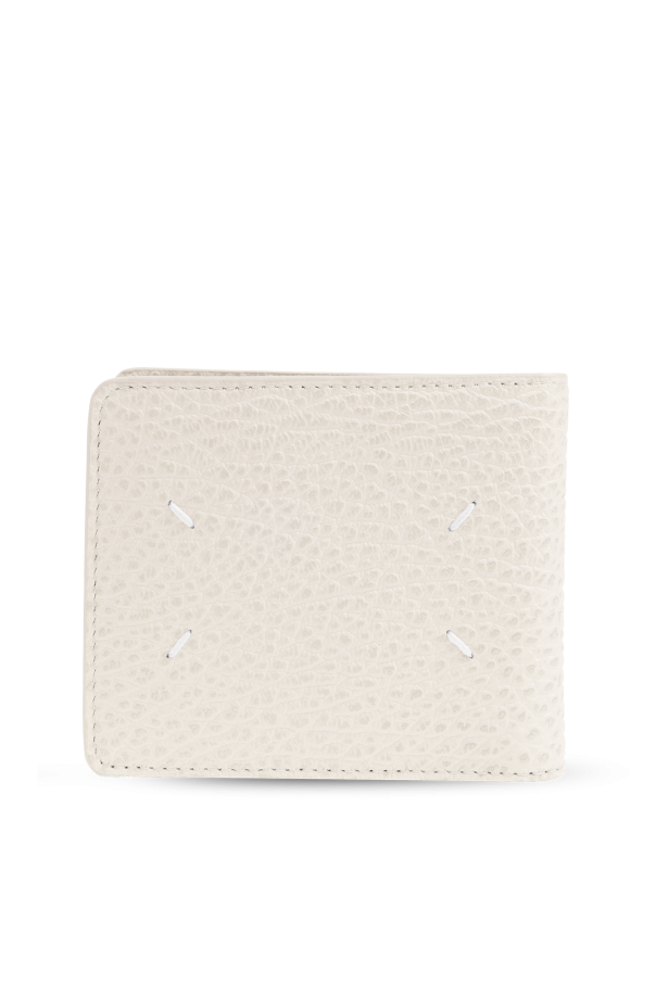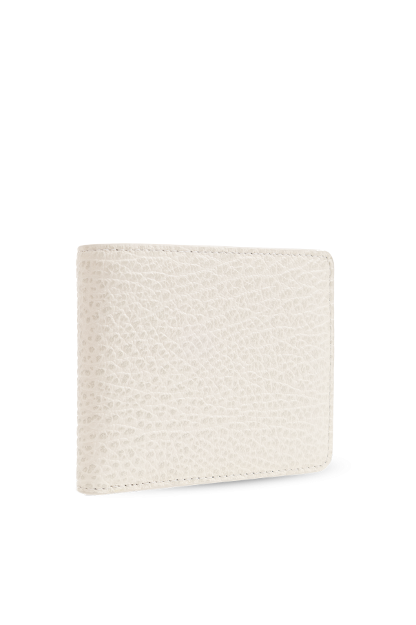 Cream and light grey bifold wallet from Maison Margiela. Made of leather, this item features the brand’s signature stitches in white as well as two bill compartments, two slip pockets and eight card slots inside.