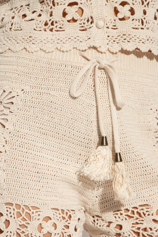 Light beige crochet shorts from Zimmermann. Made of cotton, this pair features an elastic drawstring waistband with tassels and openwork floral pattern.