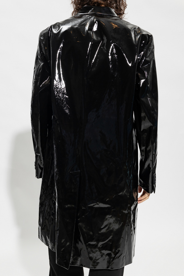 Black double-breasted coat from Raf Simons. Crafted from coated cotton, this design features button fastenings, sleeve patch with a logo, two flap pockets, one slip pocket, single rear vent, notch lapels and long sleeves with buttoned cuffs.