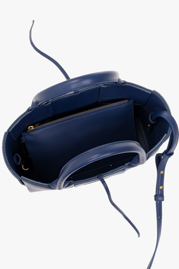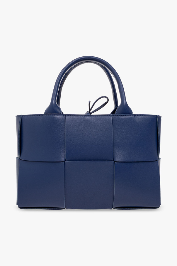 Navy blue ‘Arco Mini’ shopper bag from Bottega Veneta. Crafted from textured calf leather, this design cinches closed with drawstrings and features two half-round handles, a long strap, gold-tone metal elements and one internal compartment with a removable zip pouch.