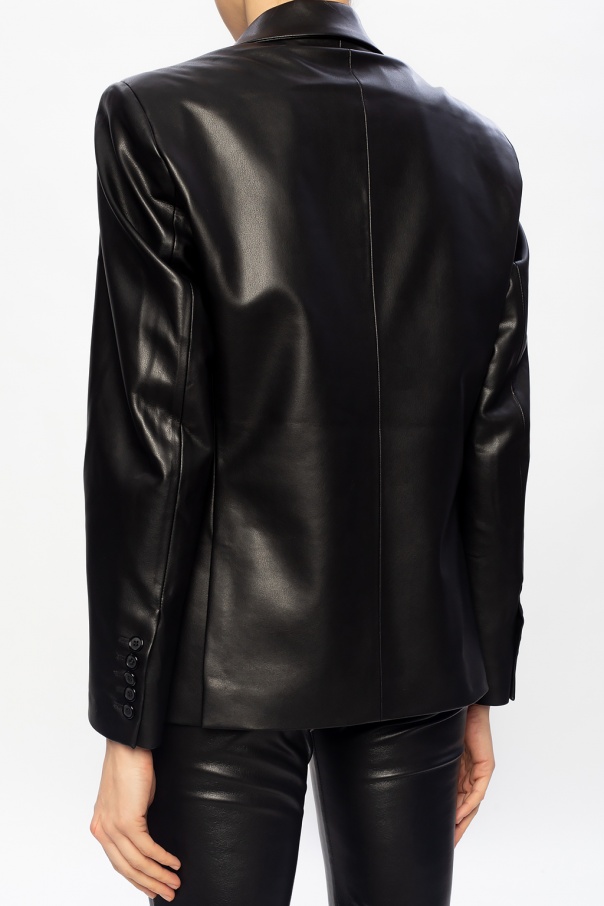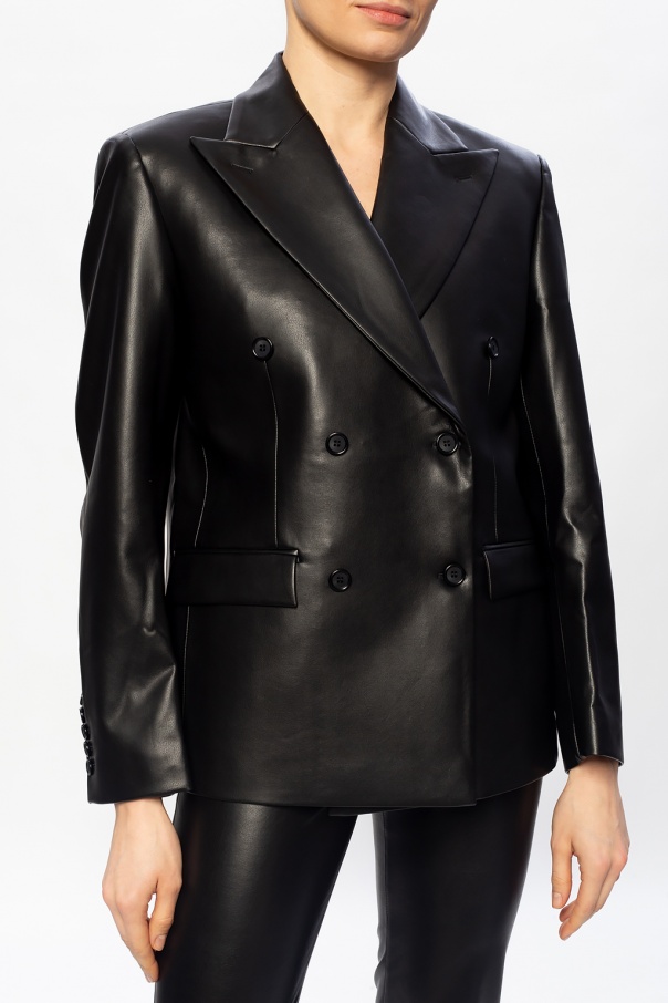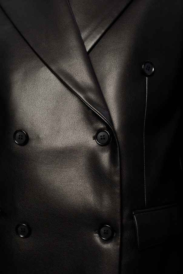 Black blazer from MISBHV. Crafted from vegan leather with a double-breasted silhouette, this style fastens via buttons and employs peaked lapels, two flapped pockets on the front and a double vent on the back.