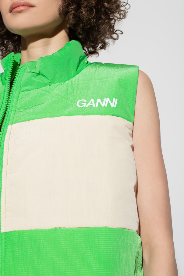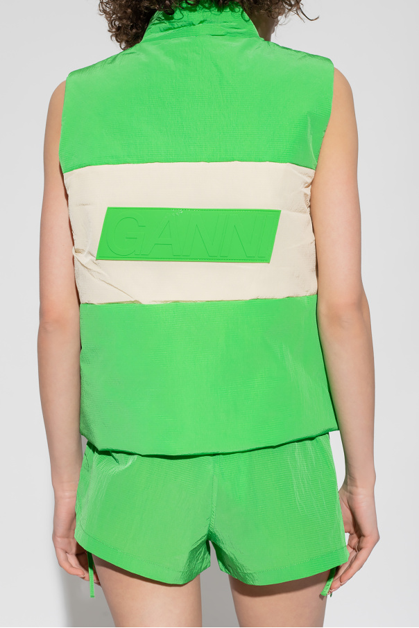 Green and cream vest from Ganni. Crafted from recycled materials, this style fastens with a zipper and showcases a white graphic print with the brand\'s logo and two zip pockets.