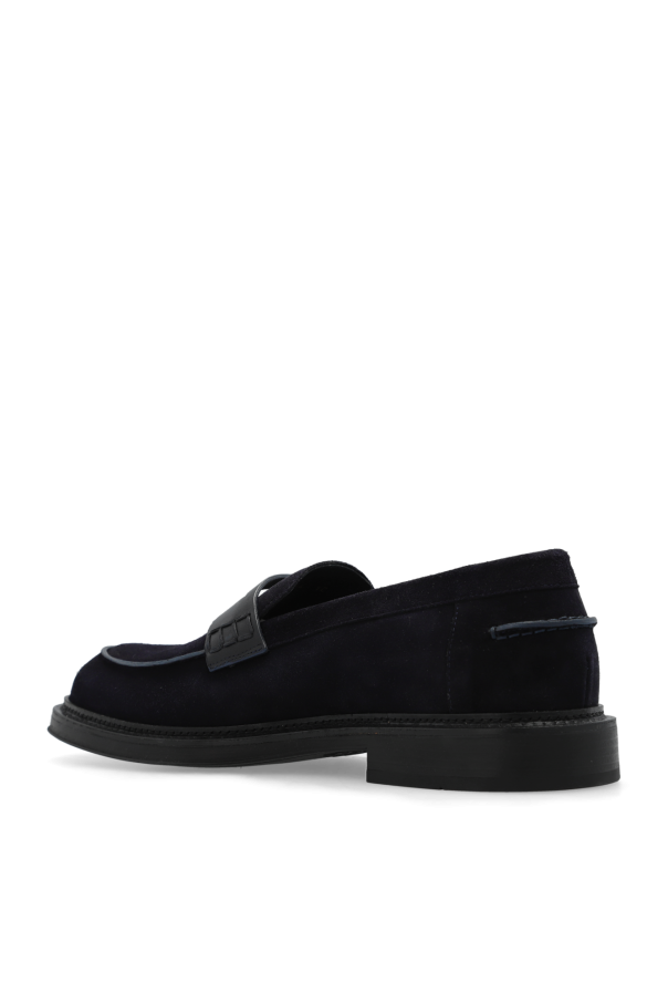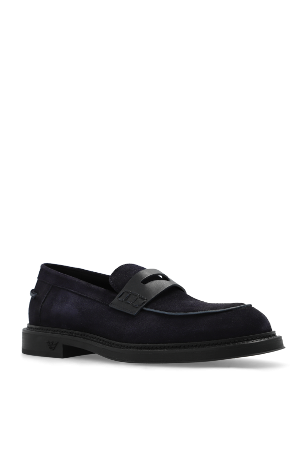 Navy blue loafers from Emporio Armani. Made of suede and trimmed with leather, this model sits on a black rubber sole accentuated with a logo and features a decorative strap on the front.