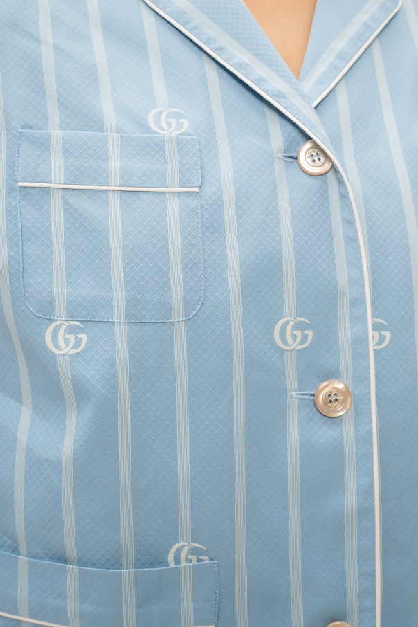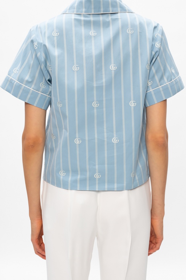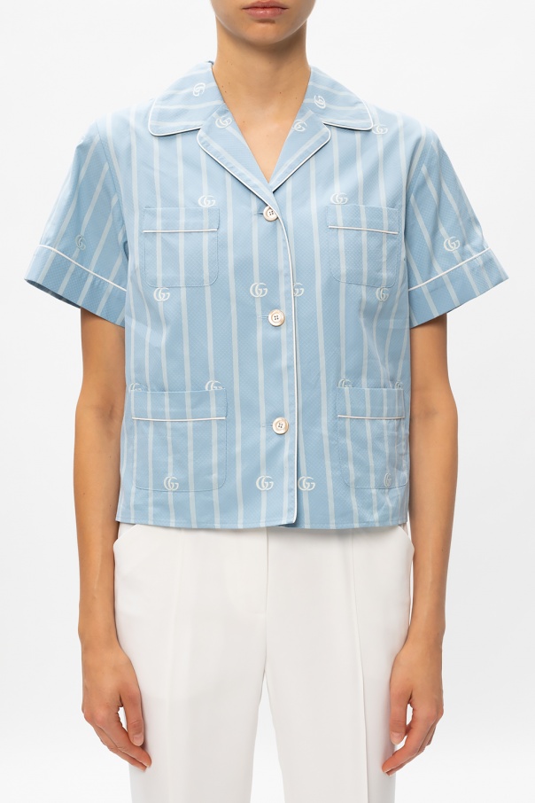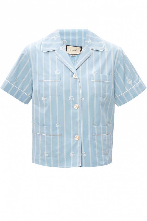Light blue top from Gucci. Crafted from cotton, this short sleeve design features button fastenings, a stripe pattern, white logo embroidery and four slip pockets.