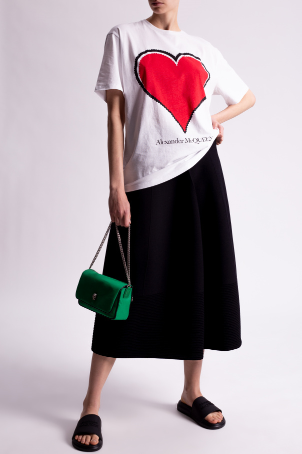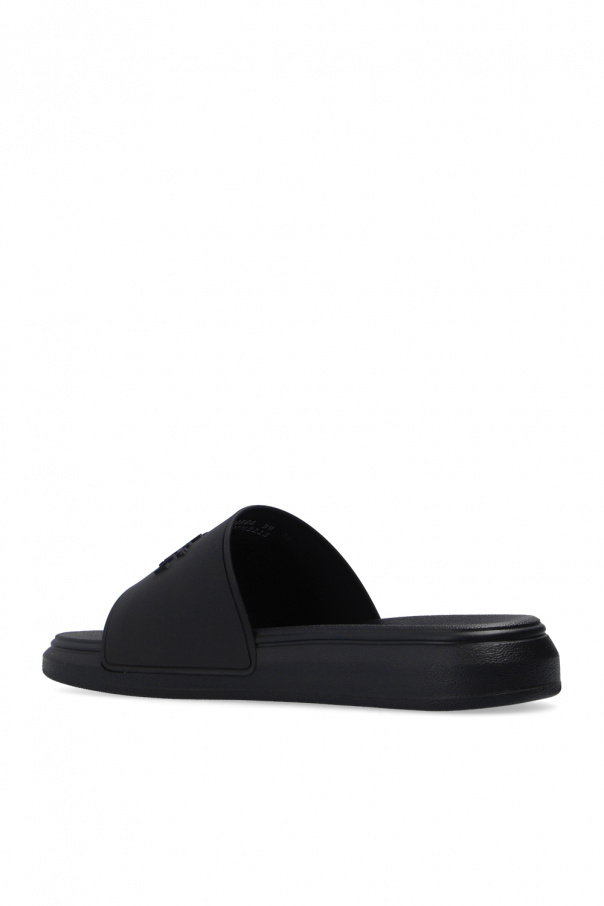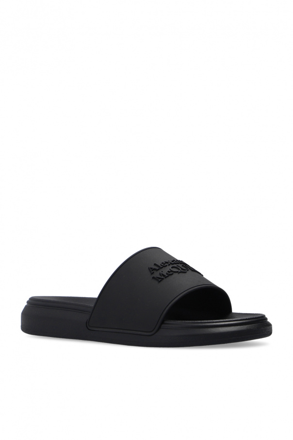 Black slides from Alexander McQueen. Set on black rubber sole, this pair features a raised logo appliqué.