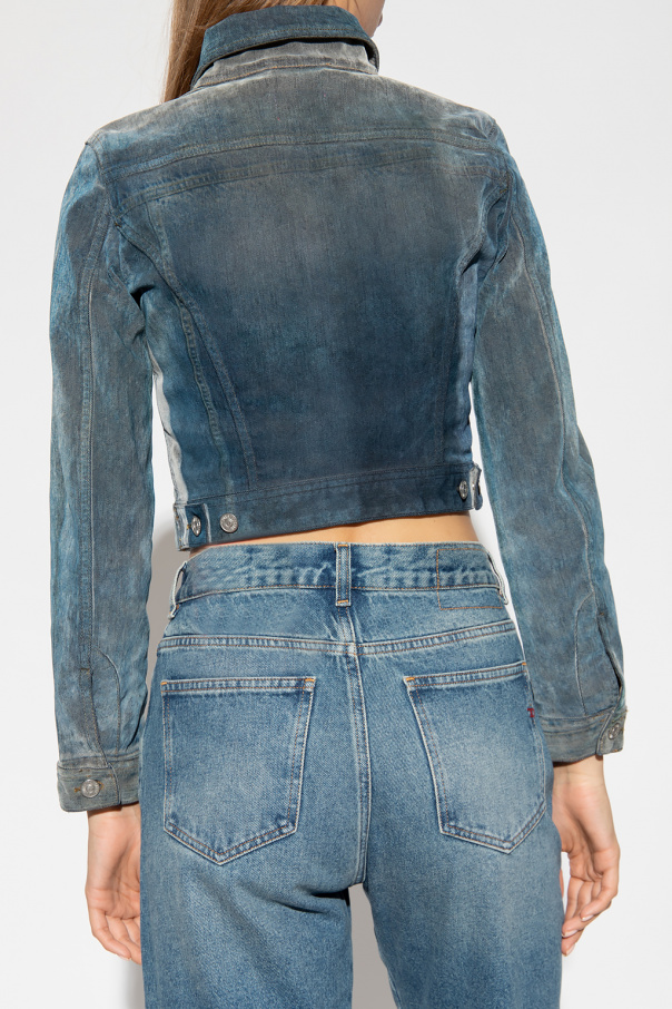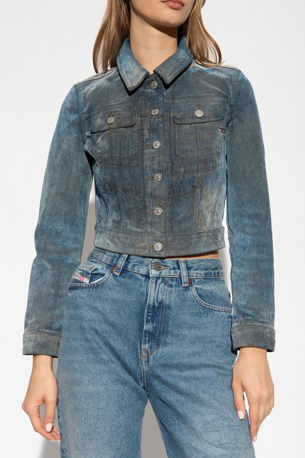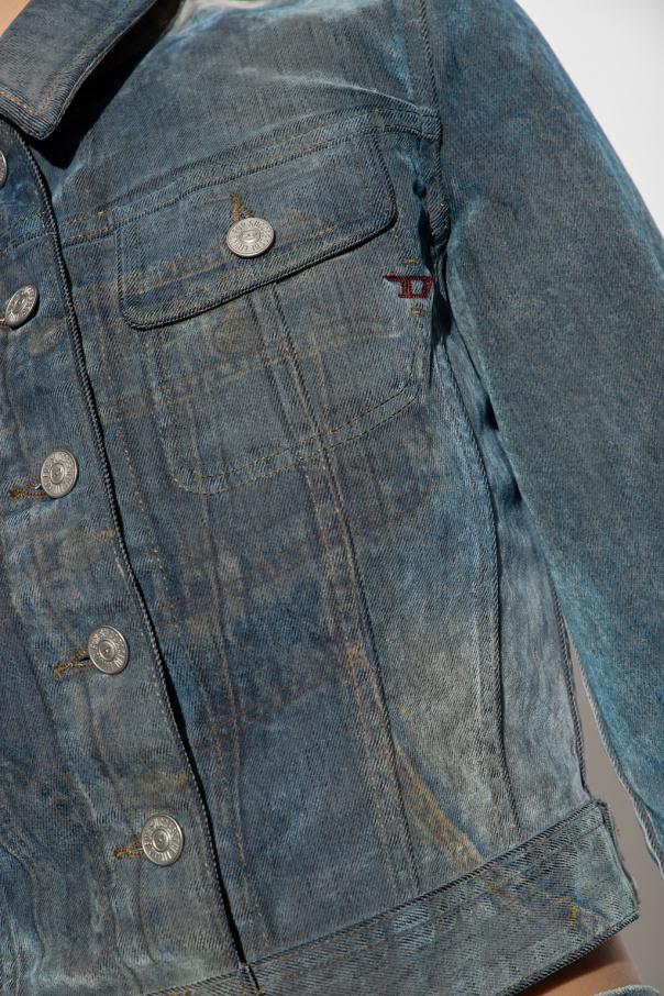 Navy and beige ‘DE-SLIMMY’ jacket from Diesel. Crafted from cotton, this long sleeve design features button fastenings, maroon logo embroidery and two buttoned flap pockets.