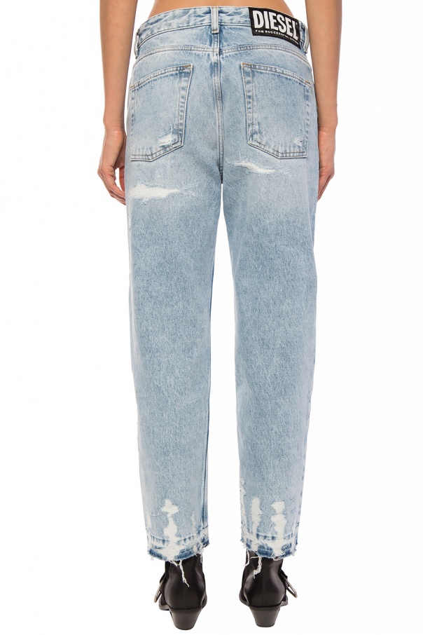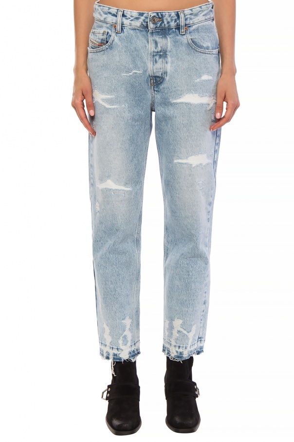 Blue ‘Aryel’ distressed jeans with a raw trim from Diesel. Fastened with buttons. Decorated with a black and white logo patch. Two slip pockets on the front and at the back. Straight legs.