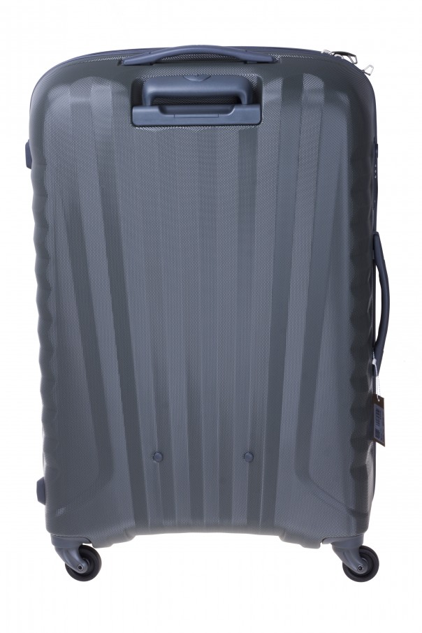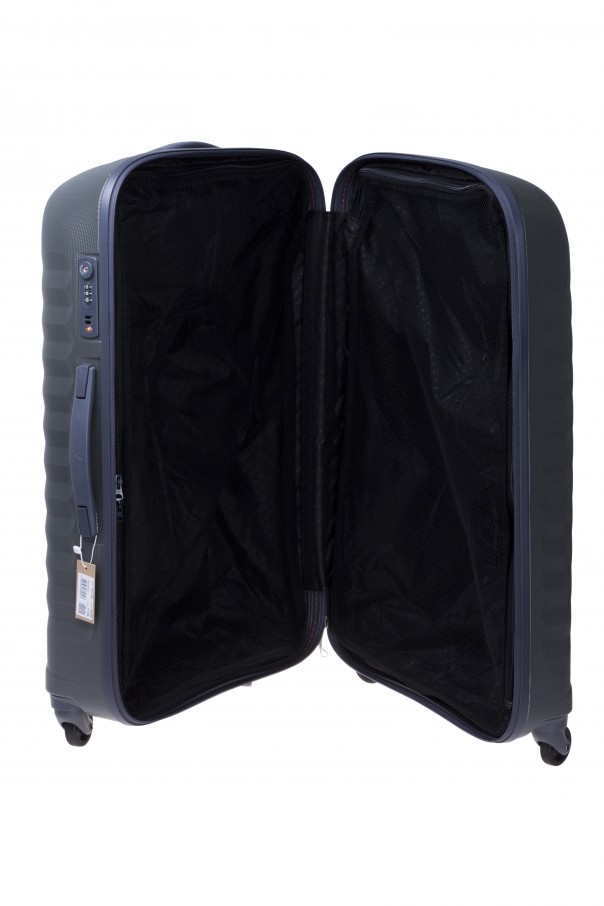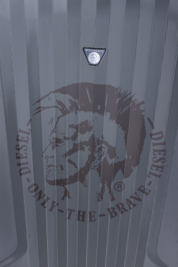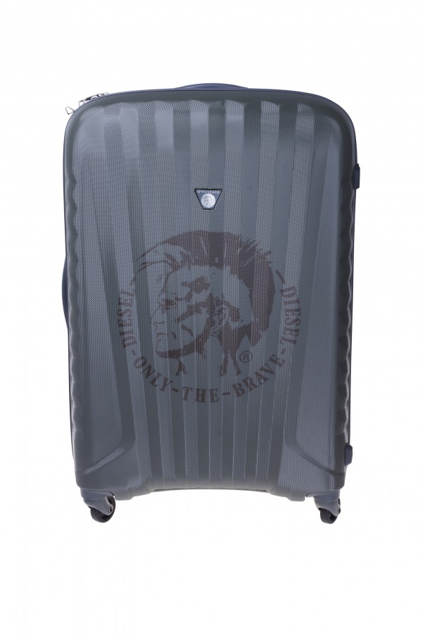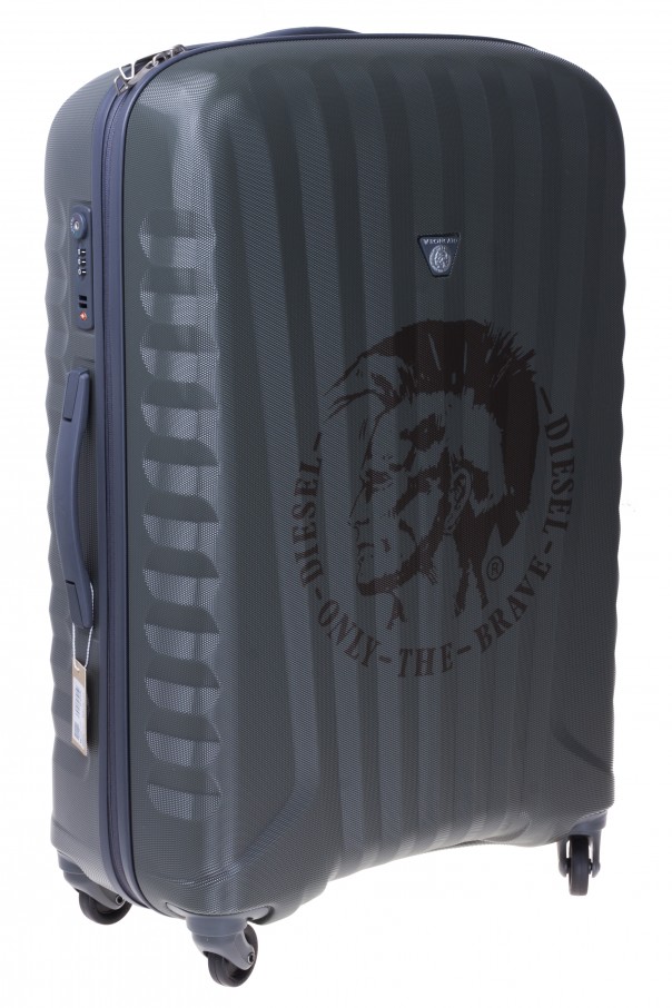 Blue 'Move M' travel bag from Diesel. Black logo on the front. Built-in padlock. Four wheels.