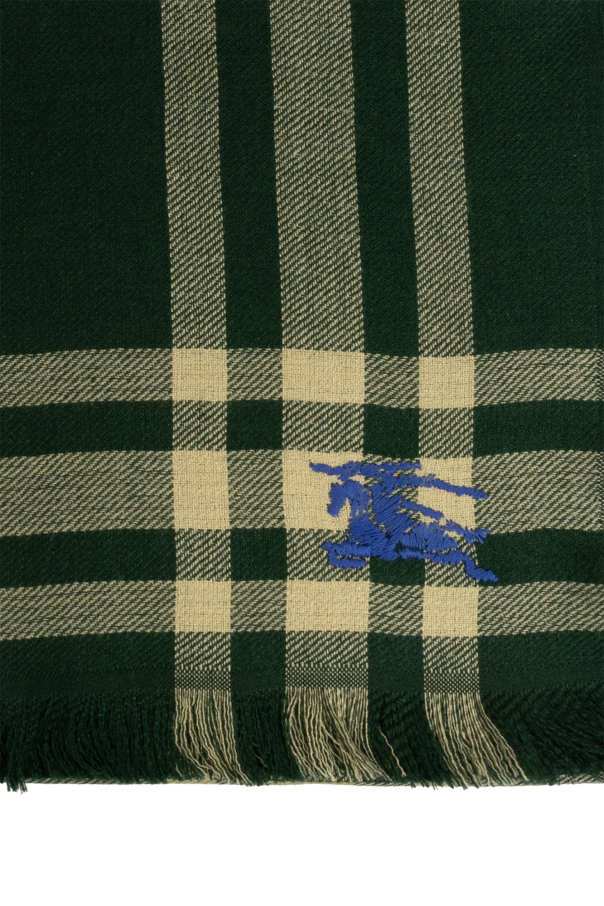 Green and yellow scarf from Burberry. Made from a wool and silk blend, this item showcases a check pattern accompanied by an embroidered ‘Equestrian Knight’ motif and frayed ends.