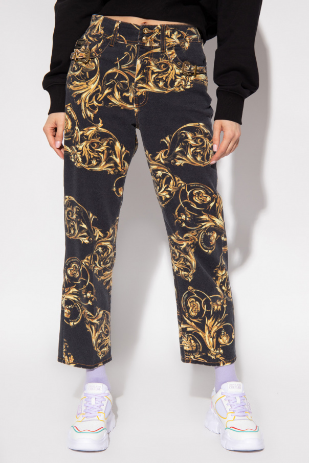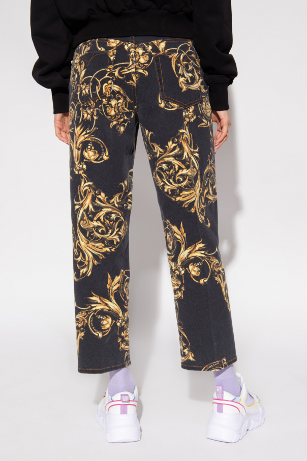 Black loose-fitting jeans from Versace Jeans Couture. Fastened with a zip and buttons, this pair features the label’s signature Regalia Baroque motif, logo patch, decorative buckle strap, three front pockets and two back pockets.