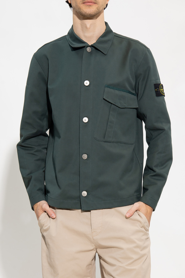 Dark green shirt from Stone Island. Crafted in thick material, this style fastens with buttons and features a detachable logo patch, a chest pocket with snaps and long sleeves with button cuffs.