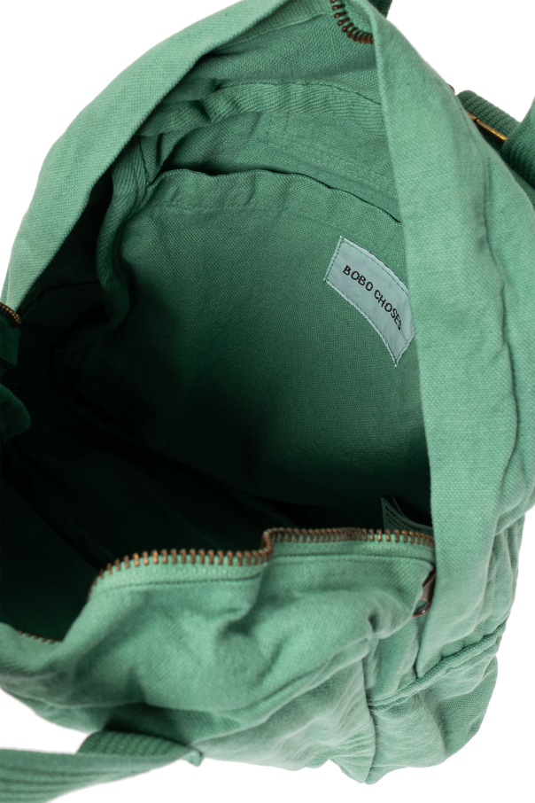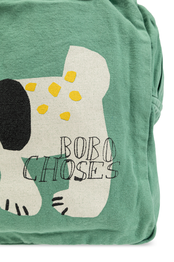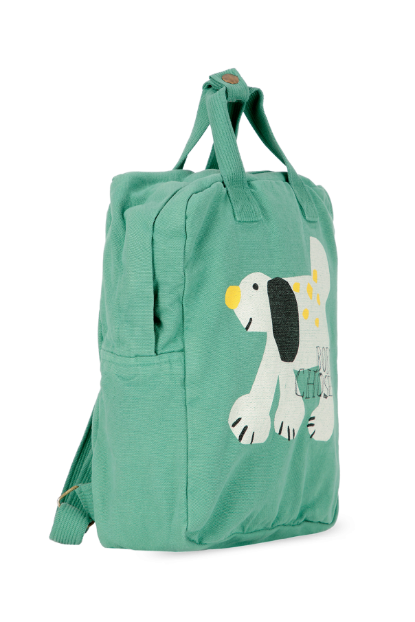 Introducing the Exclusive Cotton Backpack from the distinguished children\'s apparel brand, Bobo Choses. This exquisite piece exudes both charm and functionality, perfect for the young and adventurous. Crafted from premium cotton, this backpack showcases a rectangular shape with rounded corners and features a captivating front print of a dog with a yellow nose, black ear and paws, and yellow spots. The whimsical design is complemented by the iconic \"BOBO CHOSES\" inscription, adding a playful yet sophisticated touch. The backpack is predominantly green, boasting adjustable straps for a customized fit and a convenient top handle for easy carrying. The spacious interior includes an additional small pocket, ideal for organizing essentials, and is lined with the Bobo Choses logo label, ensuring authenticity and style. Why Choose This Product? Exclusive design from the renowned Bobo Choses brand. Constructed from high-quality cotton for durability and comfort. Adjustable straps to accommodate your child\'s growth. Spacious main compartment with an extra interior pocket for organization. Playful and unique dog print that appeals to children\'s imaginations.