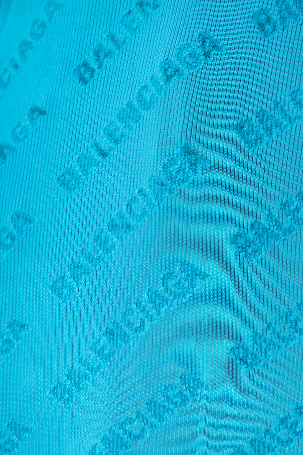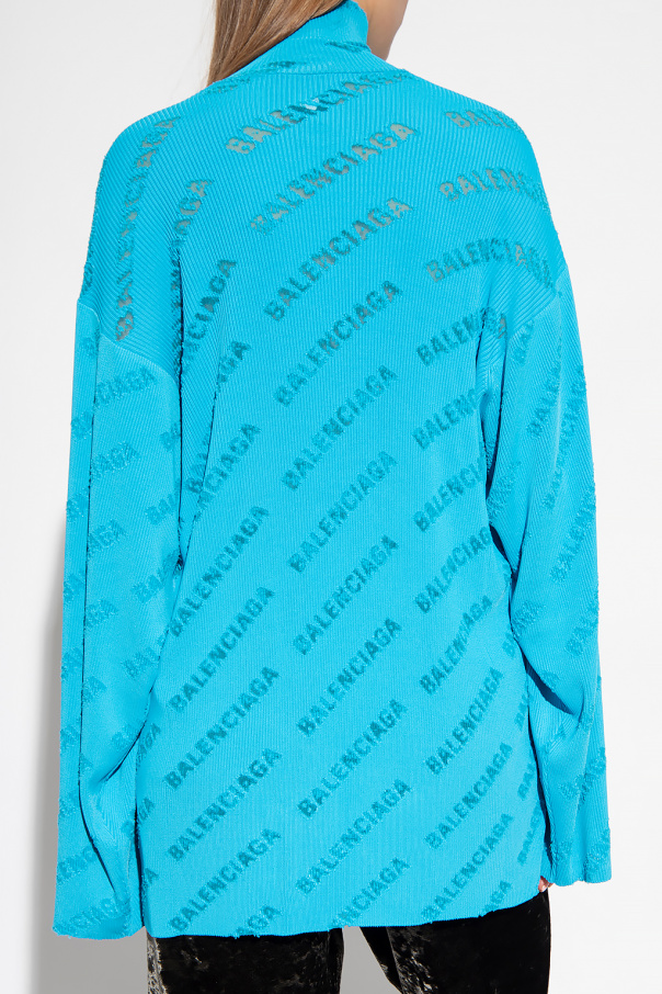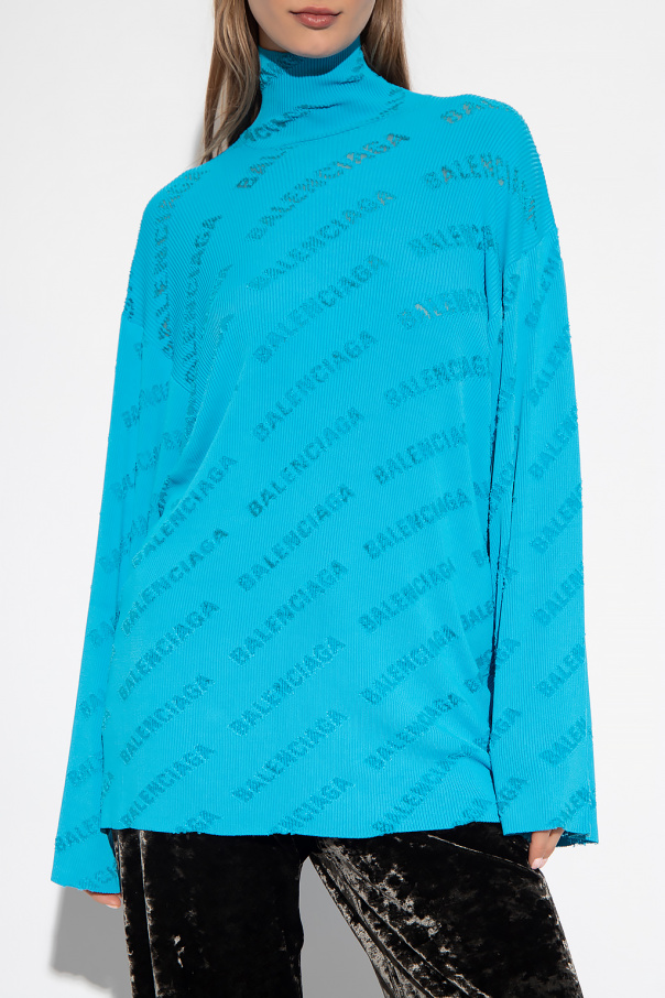 Blue turtleneck sweater from Balenciaga. Crafted in a ribbed knit with an oversize fit, this style features transparent logo inserts, dropped shoulders and draped long sleeves.