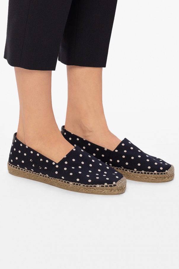 Navy blue and brown woven espadrilles from Saint Laurent. Set on a brown rubber sole, this pair showcases a logo patch and white polka dot pattern.