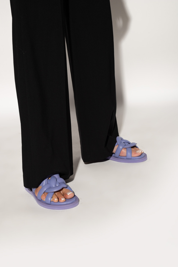 Purple ‘Georgie’ slides from Coach. Resting on a purple rubber sole, this pair is decorated with woven logo details.