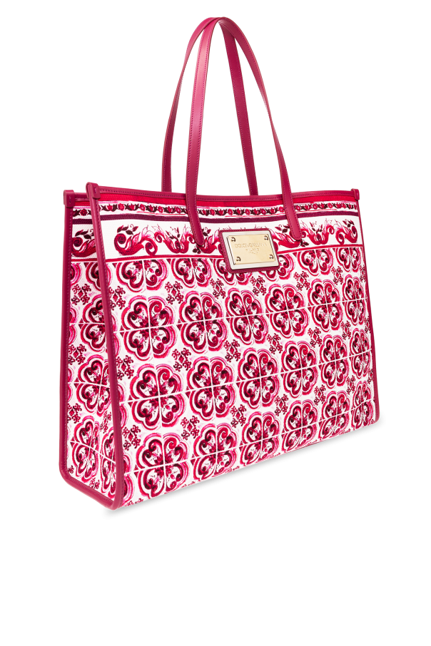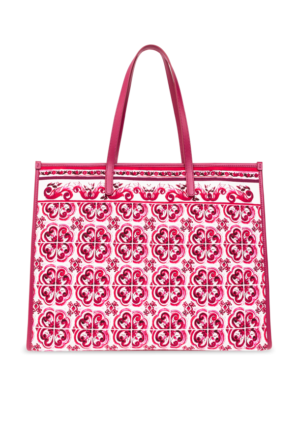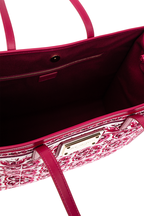 Dark pink and white shopper bag from Dolce & Gabbana. Crafted in canvas boasting the Majolica print, this design secures with a magnetic snap and features a logo application on the front, leather trims, two half-round straps, gold-tone and silver-tone metal hardware and one internal compartment with one zip pocket.