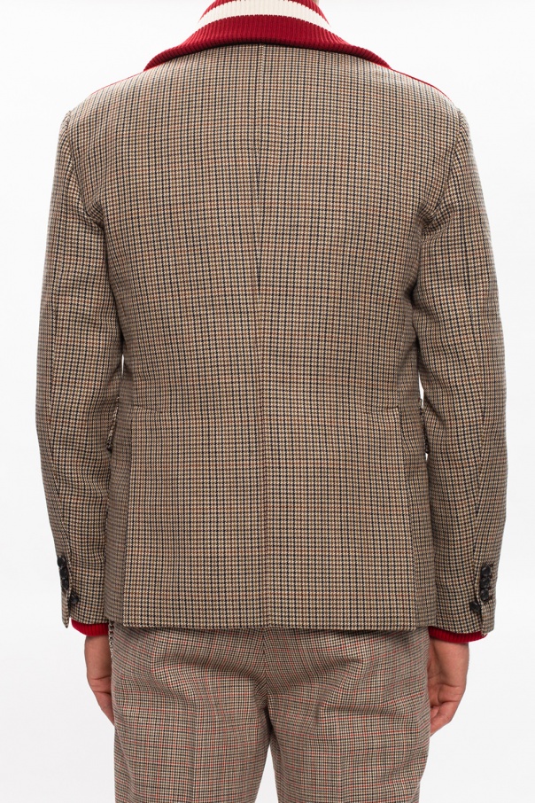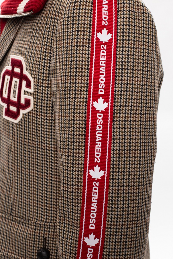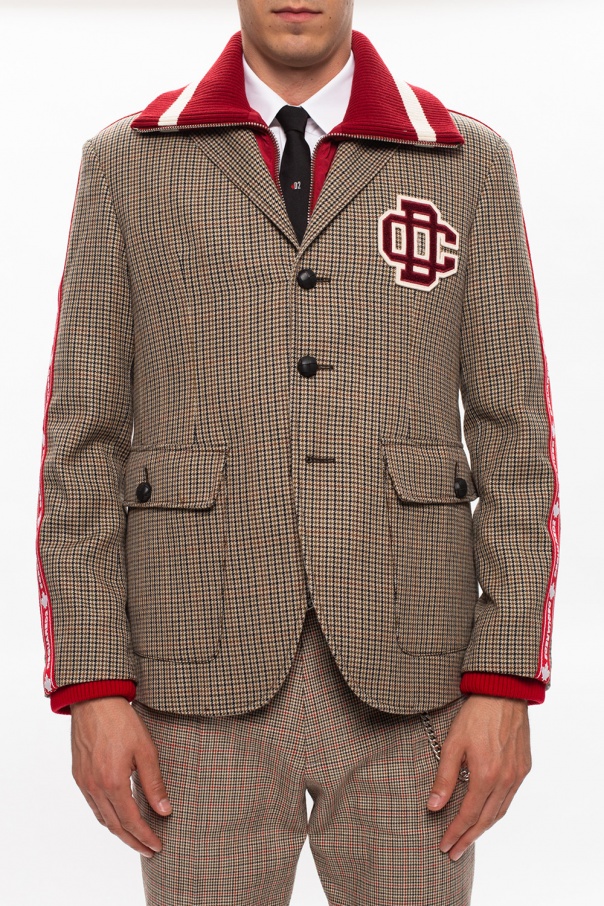 Brown, cream and navy blazer with notch lapels from Dsquared2. Crafted from wool, this item features button fastenings, an embroidered pattern, red and white logo details, two buttoned flap pockets and ribbed cuffs.