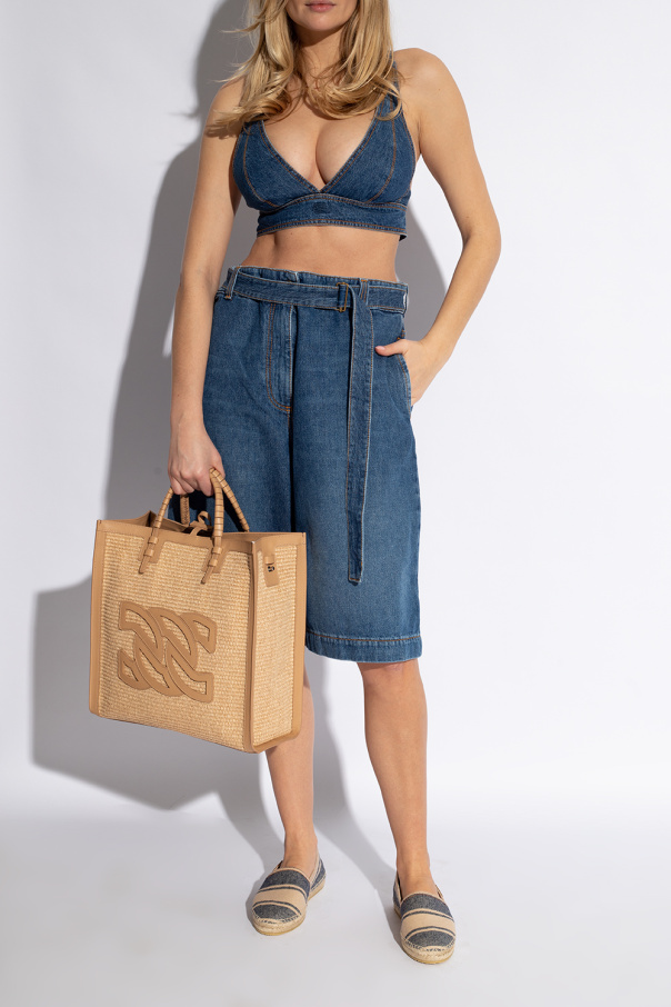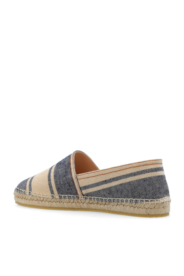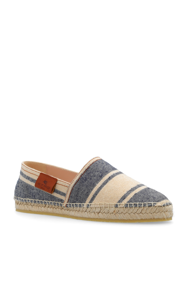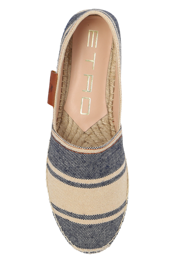 Beige and navy blue espadrilles from Etro. Embellished with colourful stripes, this model sits on a beige rubber sole with a cream-woven jute platform and features a brown leather patch with an embossed logo on the side.