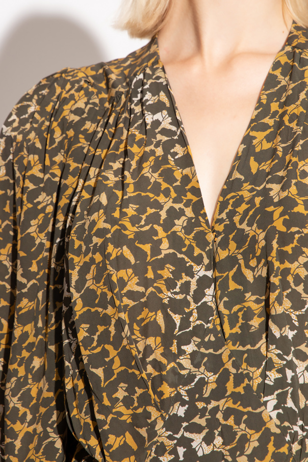 Brown, green and cream ‘Aissa’ dress from Isabel Marant Etoile. Crafted with a relaxed silhouette, this style features a graphic pattern, two slip pockets, side slits, a V-neckline, long sleeves and a pleated hem.