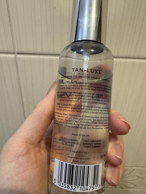 Легкая автозагар для лица и тела, распыляемая мелкими каплями, мгновенно высыхает и придает коже ровный естественный оттенок. В его составе присутствуют очищенная вода, витамины В, С и Е, масло семян малины и натуральные компоненты для придания загара. Он быстро высыхает, поэтому практически сразу можно надевать одежду. Tan-Luxe бренд подчеркивает то, что спрей не только кожу окрашивает, но и ухаживает за ней, поэтому изделию основные ингредиенты, которые действительно могут положительно влиять на состояние кожи. Таким образом, в основном спрей увлажняет за счет глицерина, сока алоэ вера и гидролизата шелка, а также защищает от свободных радикалов за счет витаминов С и Е, кофеина и масла малиновых косточек.