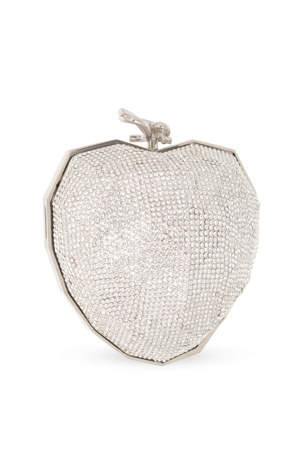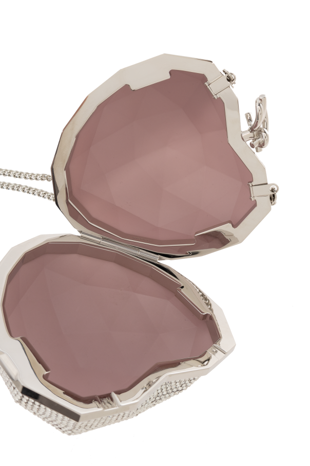 Introducing the \"Faceted Heart\" shoulder bag, a masterpiece from the renowned designer Jimmy Choo. This exquisite accessory transcends the ordinary, offering a unique blend of sophistication and whimsy. Its heart-shaped silhouette is meticulously sculpted with multi-faceted details, creating a three-dimensional form that catches the light and captivates the gaze. Adorned with fine silver crystals and sequins, the \"Faceted Heart\" exudes a refined and luxurious aura. The bag\'s dominant silver hue ensures its versatility, making it the perfect complement to a myriad of ensembles. Attention to detail is evident in the heart-shaped metal clasp, subtly engraved with the designer\'s signature, enhancing its exclusive appeal. The inclusion of a slender metal chain allows for flexible wear, effortlessly transitioning from a shoulder bag to an elegant clutch. Inside, a contrasting lining in possibly pink or light red hues adds a delightful surprise, enriching the user\'s experience with every opening. Crafted from high-quality materials such as brass, plastic, and crystal, the \"Faceted Heart\" is not only a statement piece but also a testament to durable, artisanal craftsmanship. The interior compartment, secured with a snap closure, reveals ample space within its sleek lining, showcasing the bag\'s practicality alongside its stunning aesthetics. Why Purchase This Product? Unique heart-shaped design with three-dimensional facets for an eye-catching look. Luxuriously adorned with silver crystals and sequins for a sophisticated sparkle. Versatile silver color and detachable metal chain for multiple styling options. Exclusive designer craftsmanship by Jimmy Choo, ensuring quality and elegance. Practical interior space with a contrasting lining for an added touch of charm.