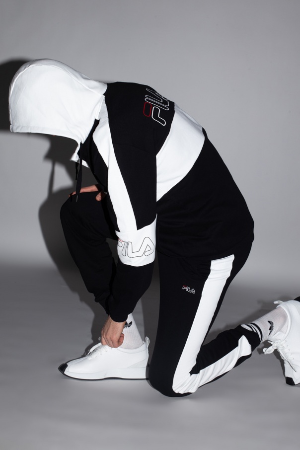 Black and white sweatpants from Fila. Fastened with drawstrings, this straight leg design features a logo print, two front pockets and one back pocket.