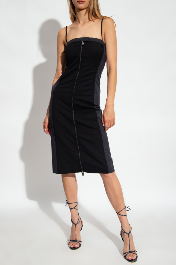 Black and grey ‘D-DAMINI’ slip dress from Diesel. Cut with a form-fitting silhouette, this style fastens with a two-way zip and snaps and features a logo charm on the front.