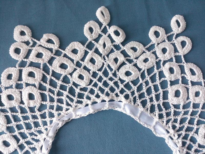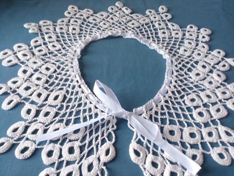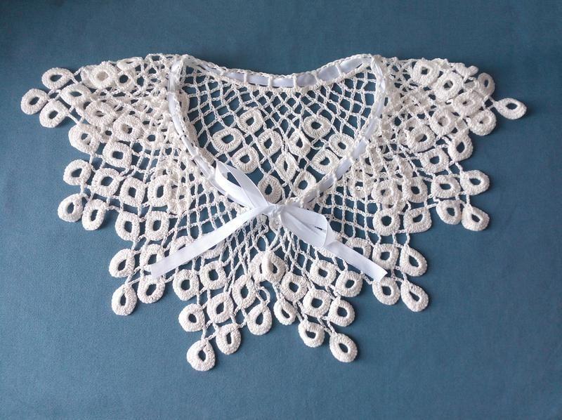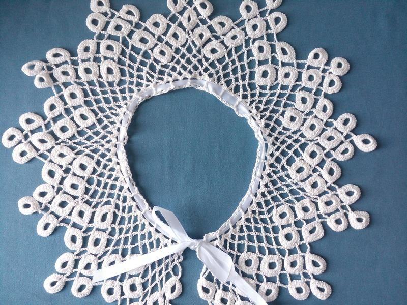 Воротник съёмный, связан крючком. Выполнен из пряжи белого цвета, что является беспроигрышным вариантом, так как сочетается с нарядом любого цвета. Отлично дополнит школьную форму, либо платье в романтическом стиле.