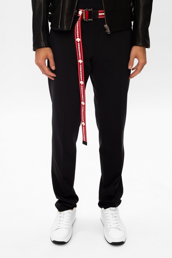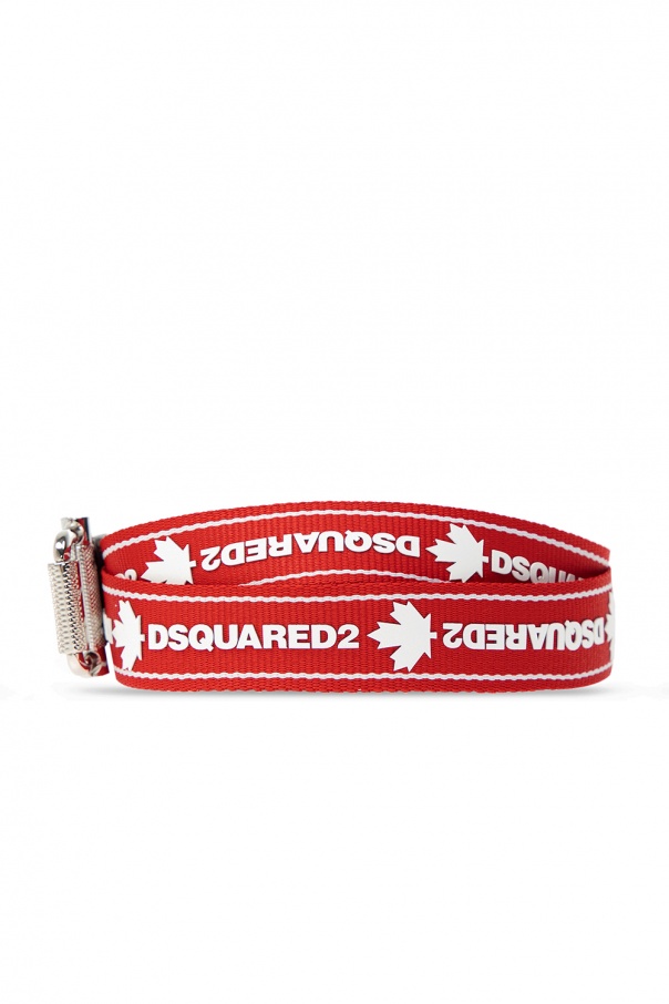 Red belt from Dsquared2. This style features a white logo emblem and a silver-tone buckle.