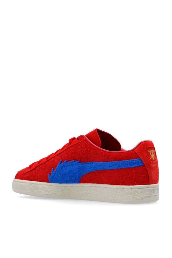 Introducing the \'SUEDE X ONE PIECE\' sports shoes by Puma, a sartorial embodiment of vibrant street-style elegance. Crafted with a sumptuous suede exterior, these sneakers boast a striking red hue complemented by a contrasting blue stripe along the side, encapsulating a bold aesthetic that commands attention. The classic low-profile silhouette with rounded toes harks back to the quintessential sports shoe design, while the natural rubber sole provides both durability and comfort for urban exploration. The meticulously matched red laces complete the cohesive look, ensuring a snug fit and seamless style. Adorned with the iconic Puma logo and additional graphics inspired by the \'ONE PIECE\' series on the lateral panel and tongue, these shoes are a testament to the fusion between high fashion and pop culture. The intricate emblem, possibly a nod to the beloved series, adds a layer of intrigue and exclusivity. Why Purchase This Product? Exquisite Craftsmanship: Premium suede construction paired with a synthetic inner lining for ultimate comfort and longevity. Iconic Design: A unique collaboration piece that marries Puma\'s athletic heritage with \'ONE PIECE\' allure. Statement Piece: Bold colors and distinctive graphics make these sneakers a standout addition to any outfit. Comfort & Durability: A flat rubber sole designed for prolonged wear and urban adventures.
