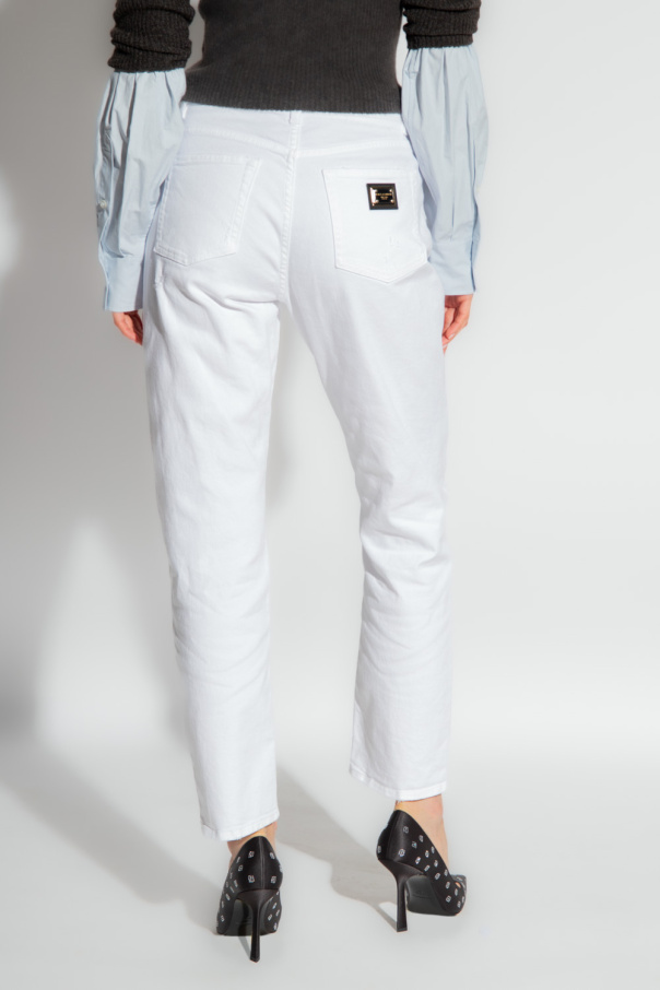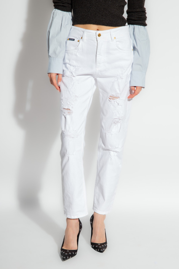 White distressed boyfriend jeans from Dolce & Gabbana. Fastened with a zip and button, this pair features logo details and five slip pockets.