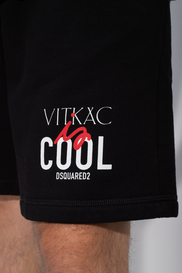 Black sweat shorts from Dsquared2. Crafted from cotton, this pair showcases an elasticated waistband, two slip pockets and a white and red graphic print with the brand's logo. Item designed to celebrate the 10th anniversary of VITKAC.