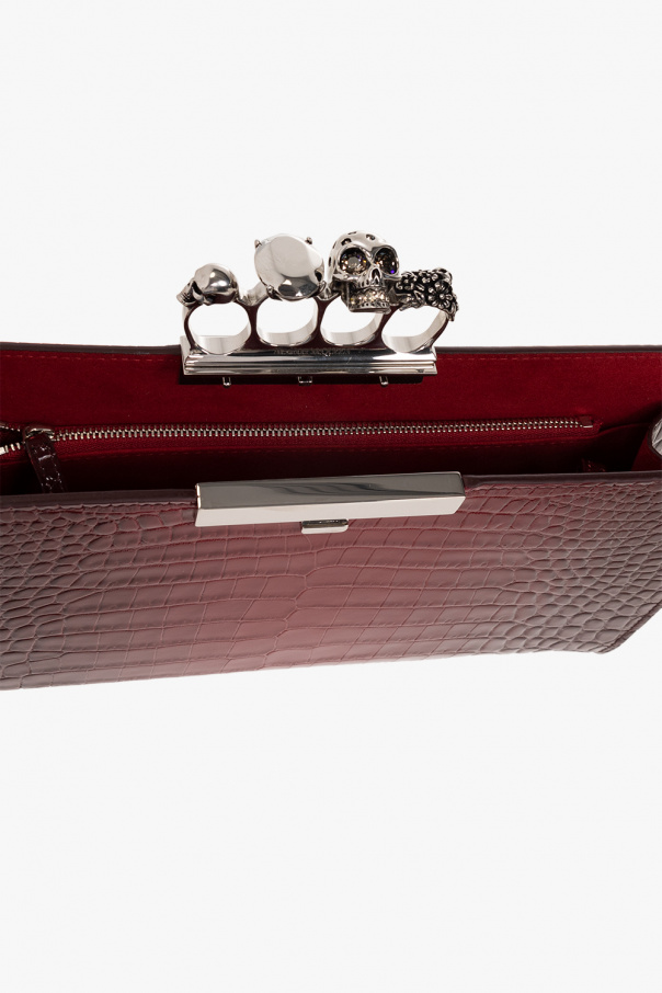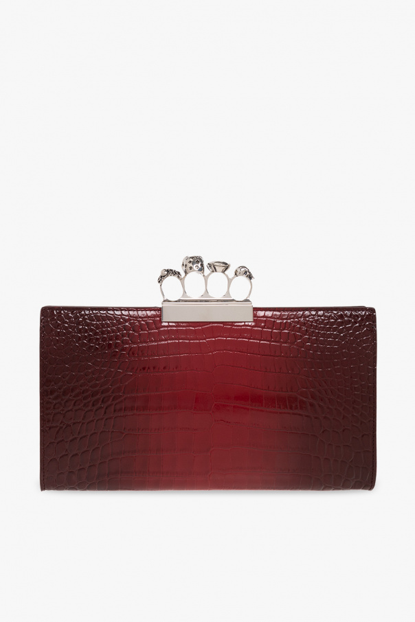 Red ‘Four Ring’ clutch from Alexander McQueen. Crafted from calf leather with a crocodile skin effect and a gradient, this model is complete with a snap closure, decorative ring handle with the brand’s signature skull embellished with crystals, silver-tone metal hardware and one internal compartment with two zip pockets.