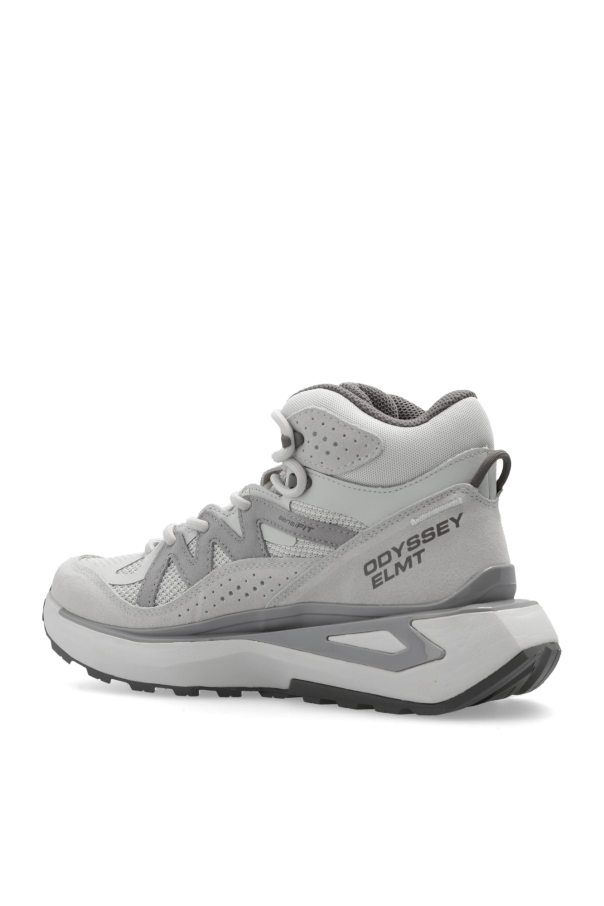 Grey ‘ODYSSEY ELMT MID GTX’ high-top sneakers from Salomon. Made of leather, fabric and synthetic material and supported by a waterproof GORE-TEX coating, this lace-up model showcases the brand\'s logo and sits on a sole with Contagrip® technology built for maximum grip on loose, soft, rugged, and uneven surfaces - it uses deep, sharp lugs made from a compound that focuses on adhesion.