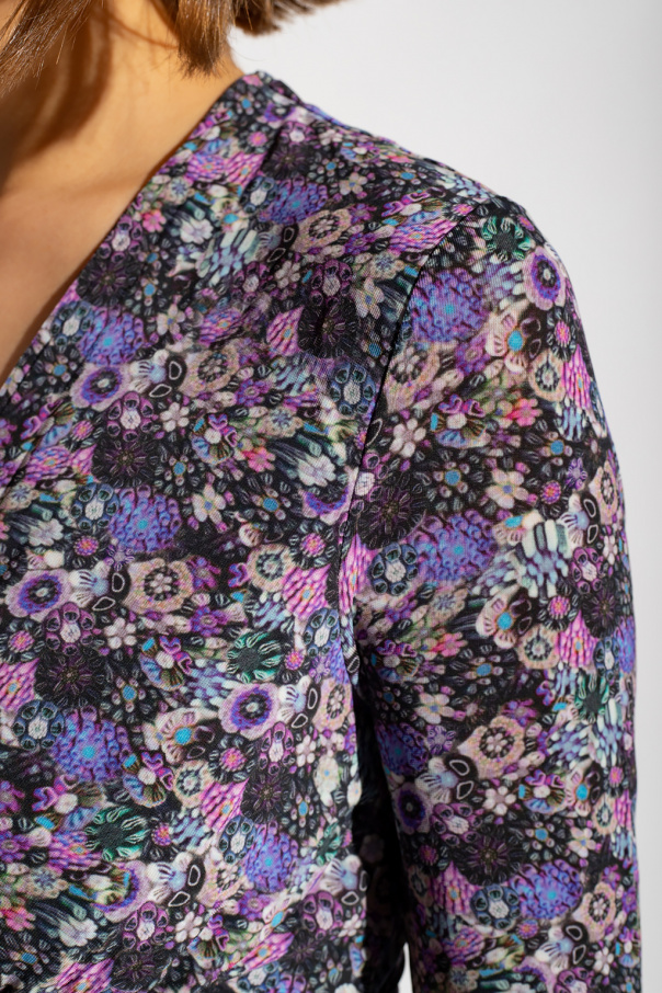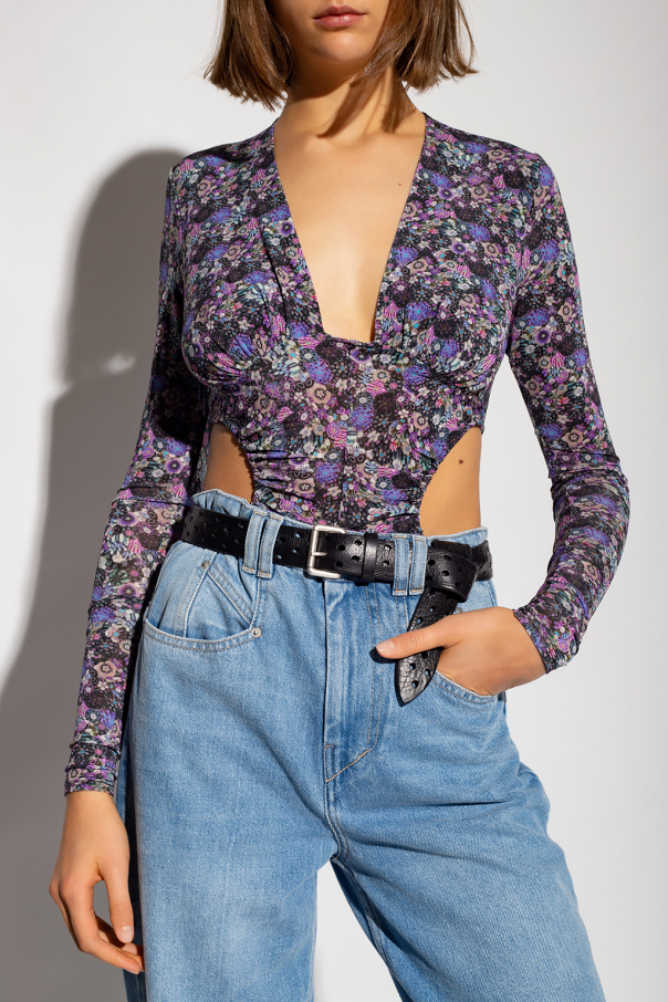 Multicoloured ‘Jorja’ bodysuit from Isabel Marant. Embellished with a graphic print, this style features a plunging V-neckline, long sleeves, snap closures at the crotch and decorative cut-outs cinched with drawstrings on the sides.