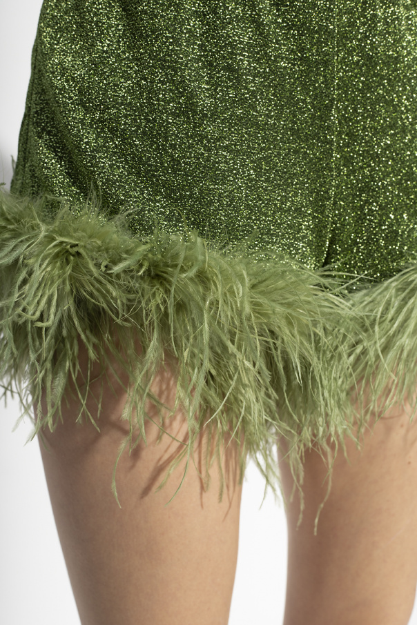 Green shorts from Oseree. Decorated with a lurex finish, this pair features is complete with an elastic waistband and ostrich feathers.