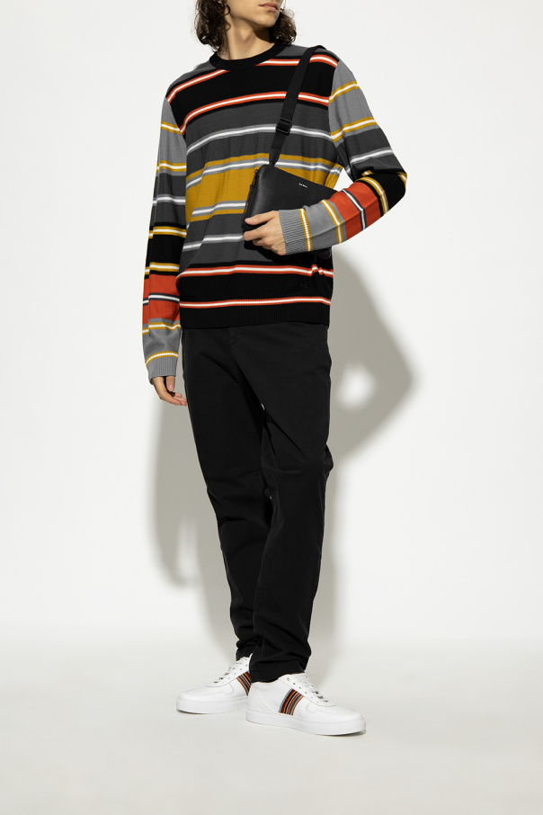 White ‘Fermi’ sneakers from Paul Smith. Made of leather, this lace-up pair is complete with perforations, the label’s signature multicolored stripe, white rubber sole and swappable laces.