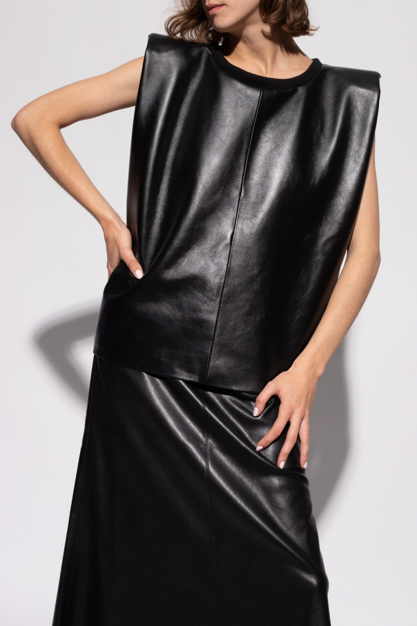 Black ‘Umayyad’ sleeveless top from The Mannei. Crafted from lamb leather with an oversize silhouette, this style features an elasticated collar, padded shoulders and a hidden zipper on the back.
