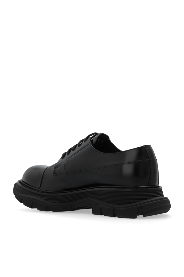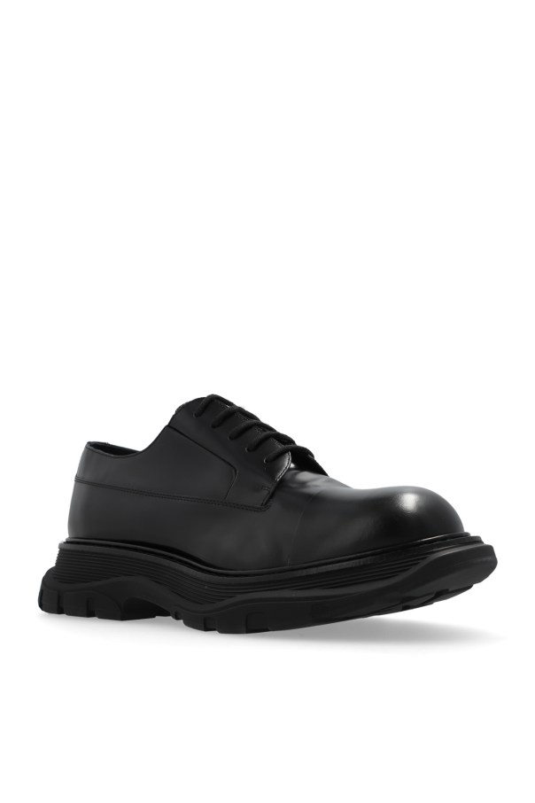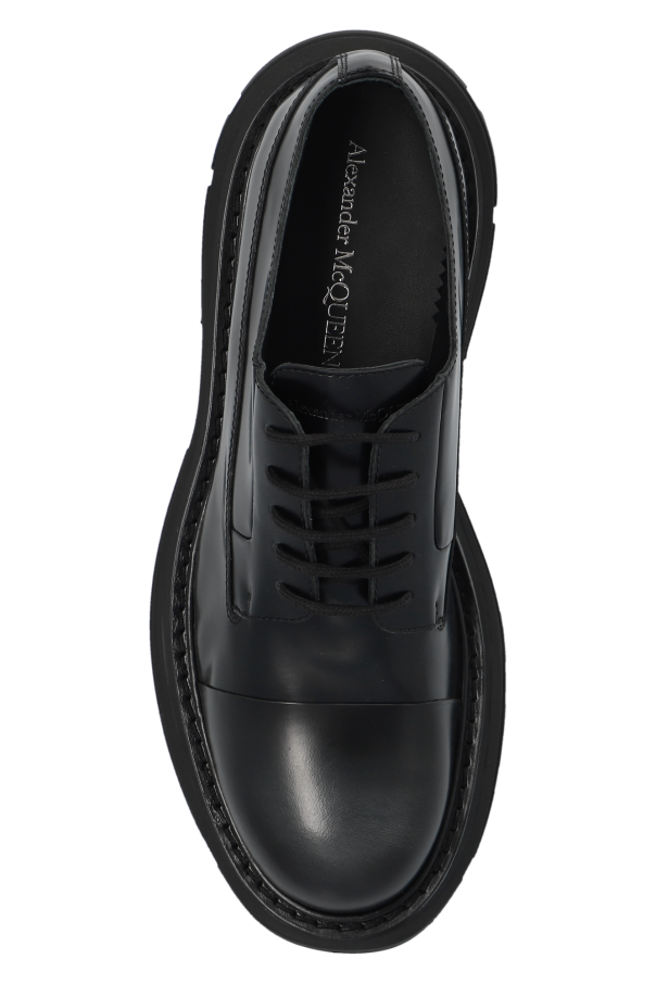 Black shoes from Alexander McQueen. Made of smooth leather, this lace-up pair features a vintage effect and a black rubber sole.