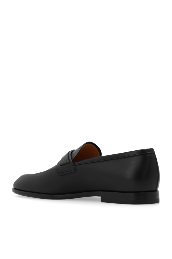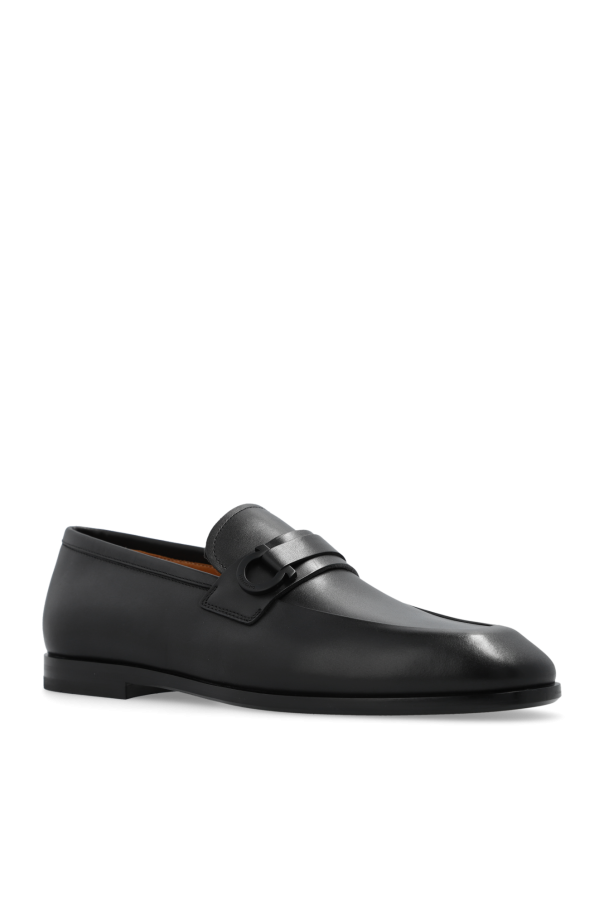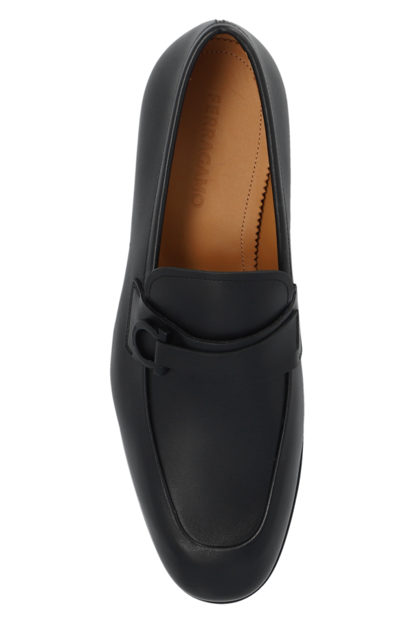 Black loafers from FERRAGAMO. Made of leather, this design features a strap with a logo-shaped appliqué on the front, black leather sole and extra wide insole.