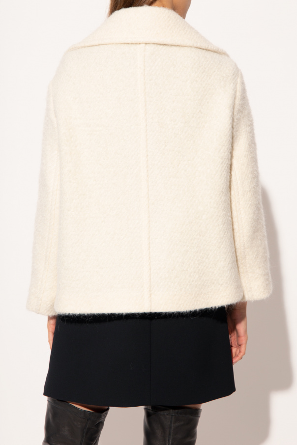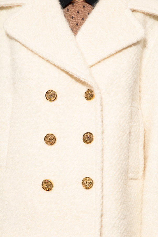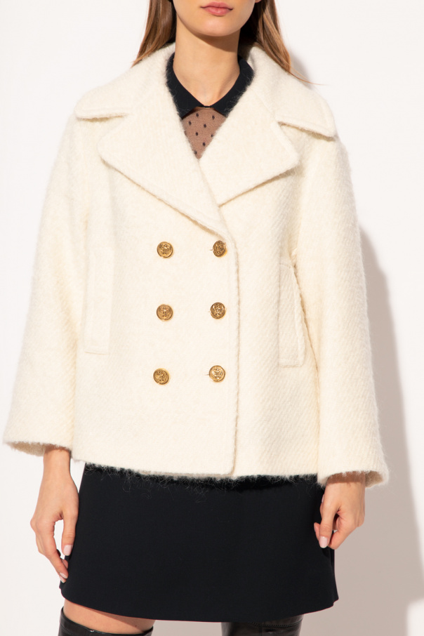 Short, cream, double-breasted coat from Red Valentino. Fastened with buttons, this long sleeve design is complete with notch lapels and two slip pockets.