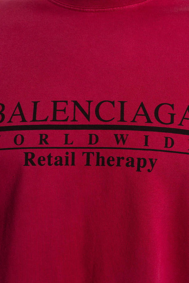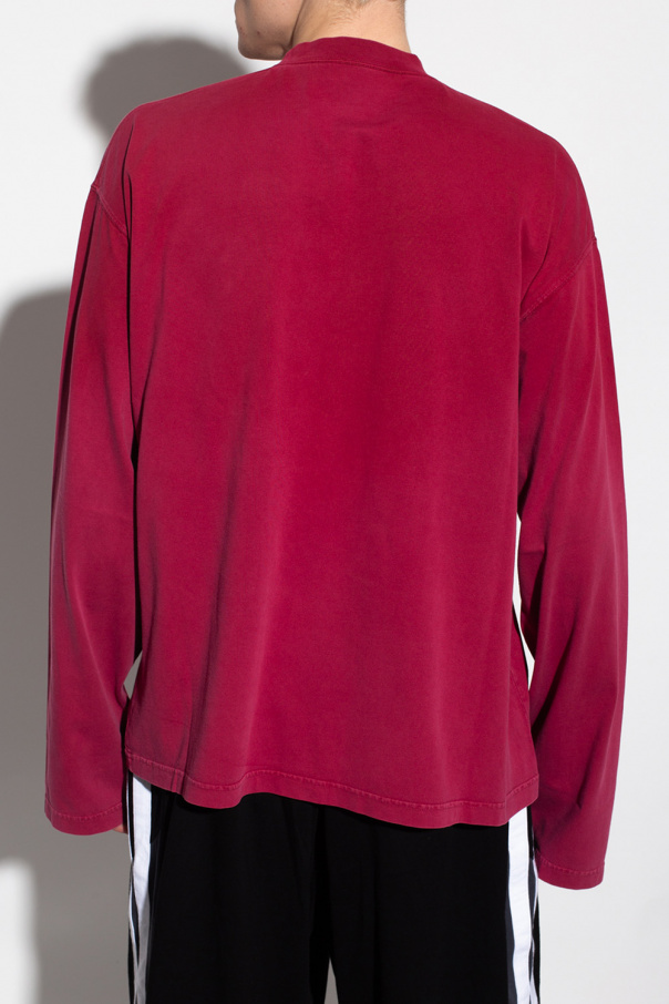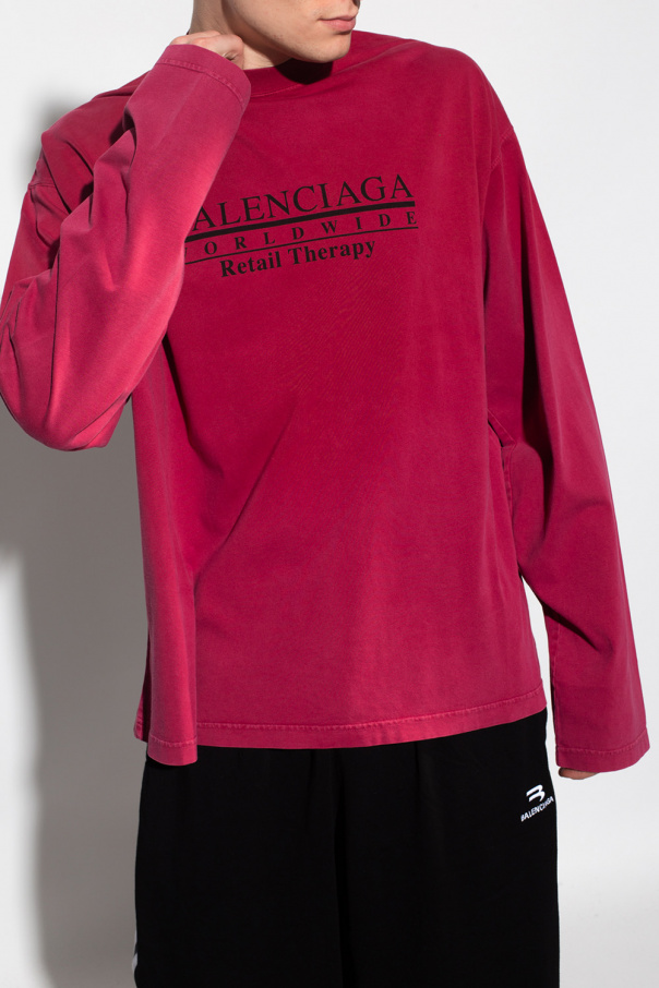 Red crewneck T-shirt from Balenciaga. Crafted from cotton, this style features long sleeves and a black graphic print with the brand\'s logo on the front.