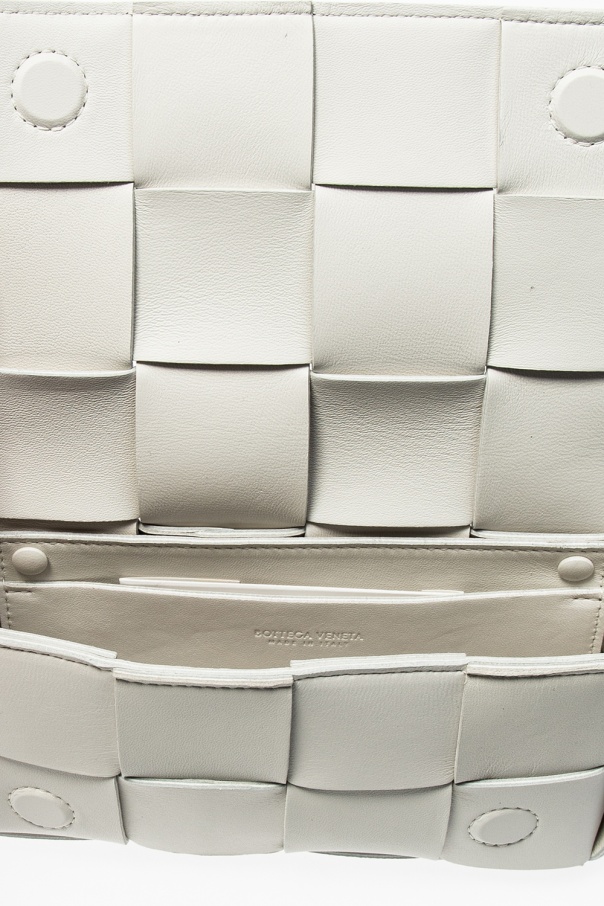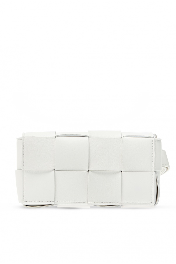 White ‘The Belt Cassette’ belt bag from Bottega Veneta. Crafted from lamb leather, this design is distinguished with the label\'s iconic \'Intrecciato\' weave and detailed with magnetic closures, an adjustable shoulder strap and interior with one compartment and one slip pocket.